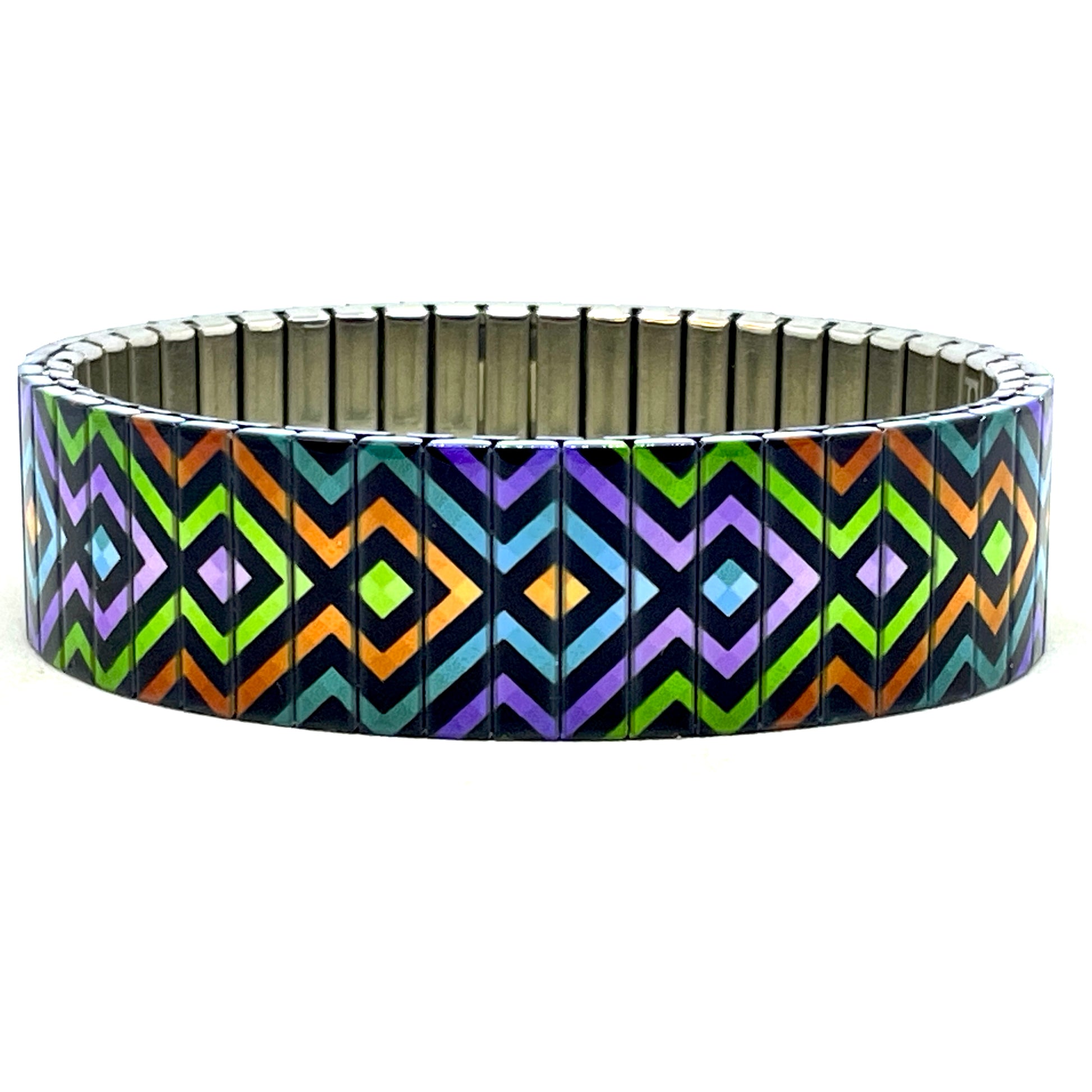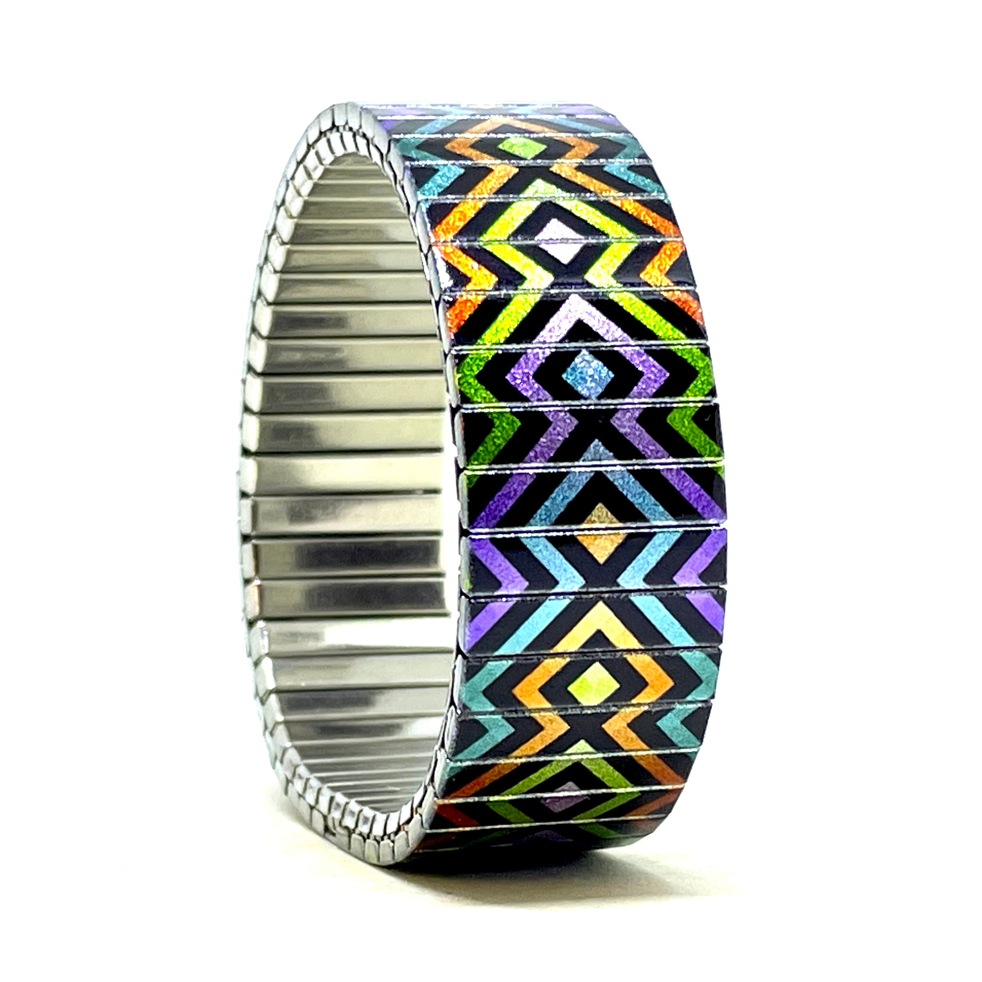 Rekbare armband van stainlesssteel. Checkers Maze design met kleurrijk grafische afbeelding. Door devele kleuren is deze armband bij veel outfits te combineren. De metallic afwerking geeft de band extra glans.