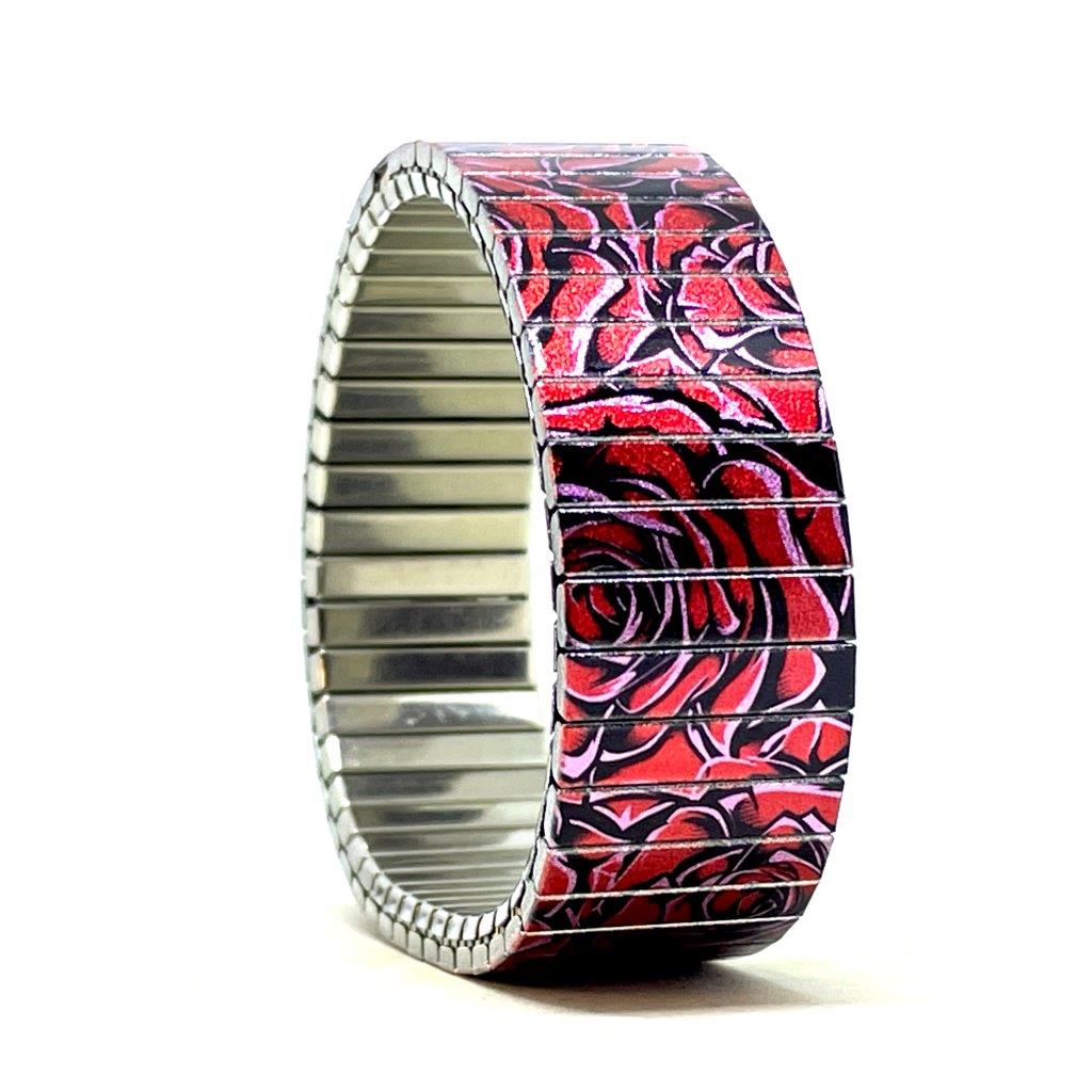 Een eeuwige bloementuin op je pols – waar rozen voor altijd bloeien in volle pracht. Deze armband vangt de tijdloze schoonheid van bloeiende rozen, met metallic tinten van paars, fuchsia en blauw die samen een betoverend kleurenpalet vormen dat nooit vervaagt.