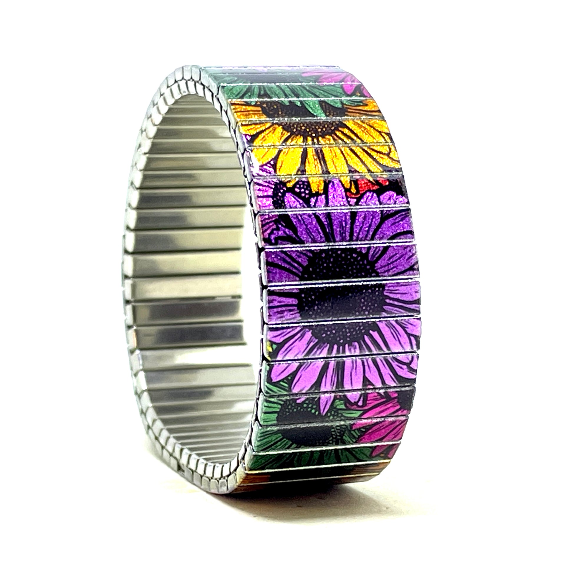 18 mm Rekbare armband van stainlesssteel. Flowers Daisies design grote gekleurde bloemen in groen, rood, geel, paars. Afwerking is polished.