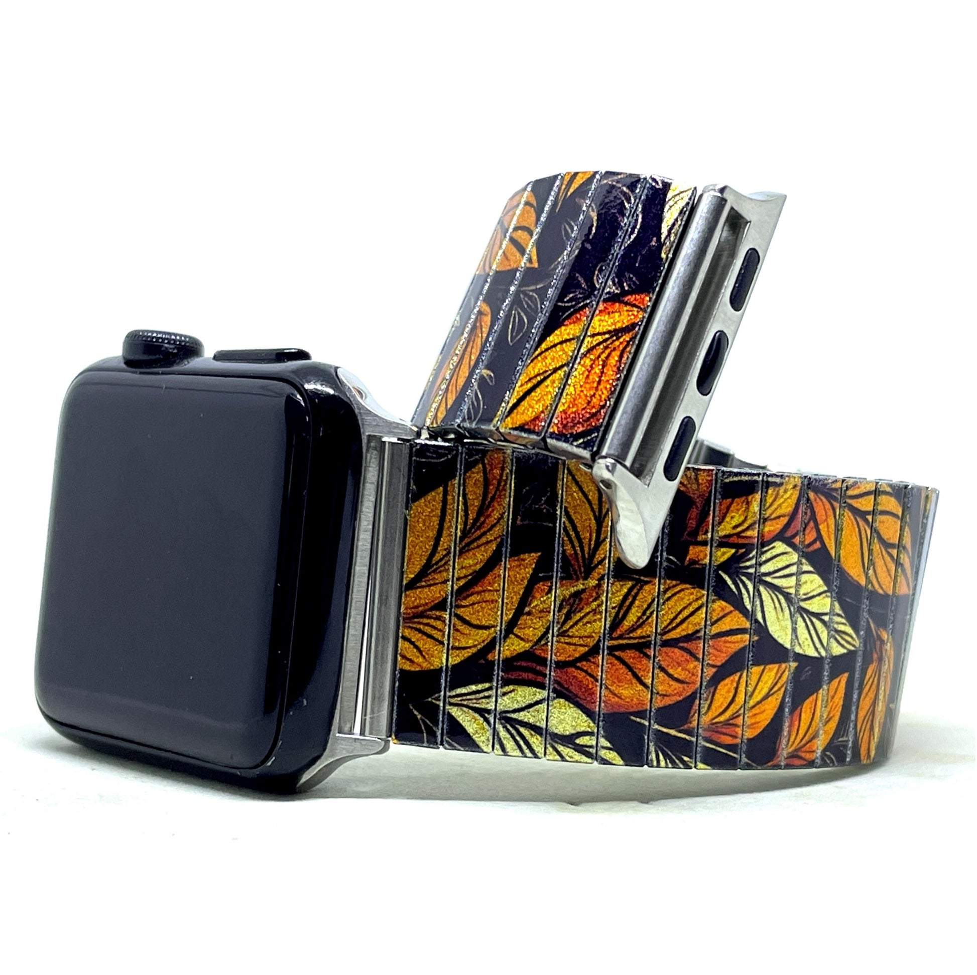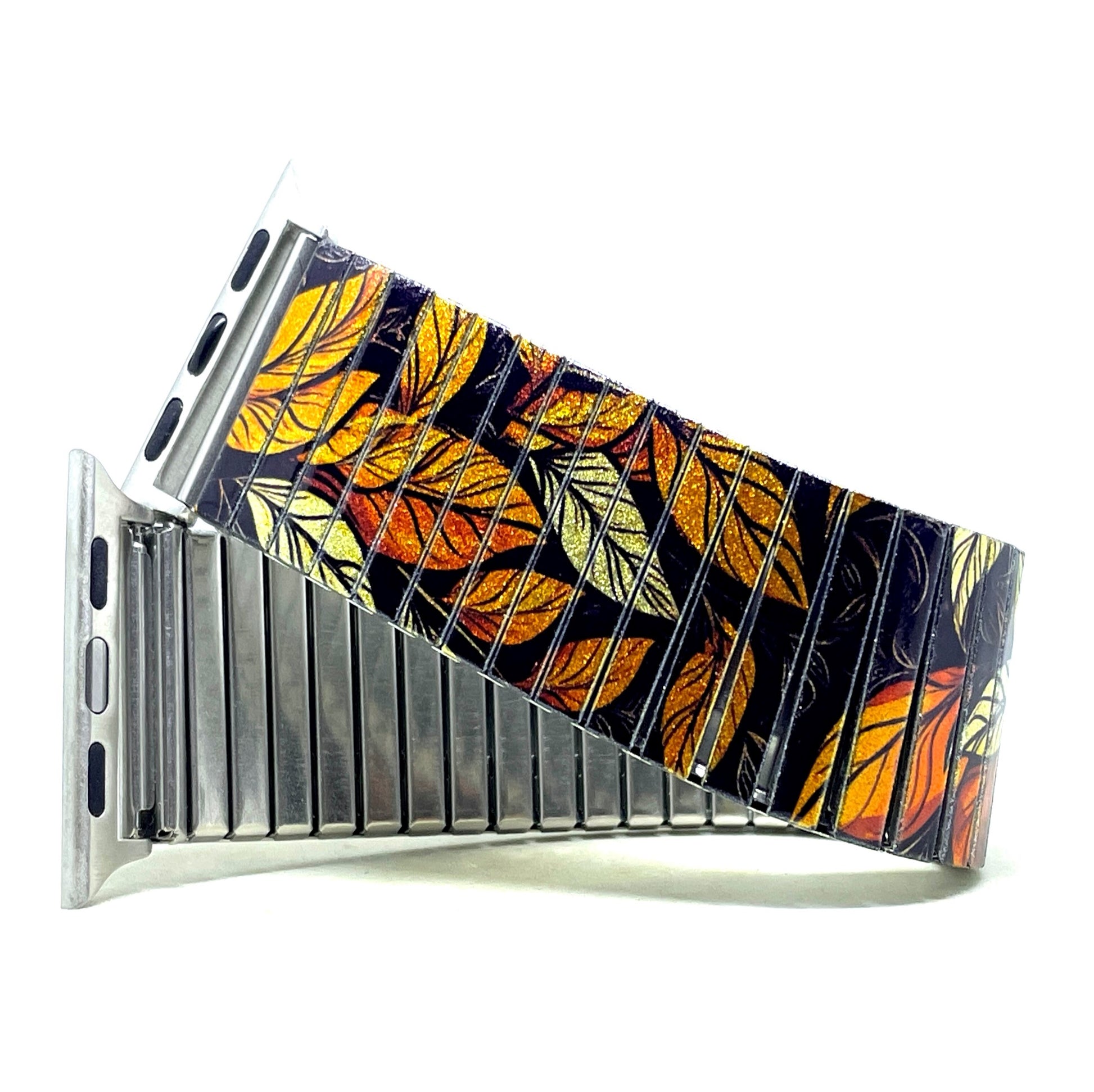 Rekbare Applewatch bracelet van stainlesssteel in Flowers Garden design. De band heeft een metallic afwerking en laat een explosie van gekleurde herfst bladeren zien. Een echte blikvanger aan je pols.