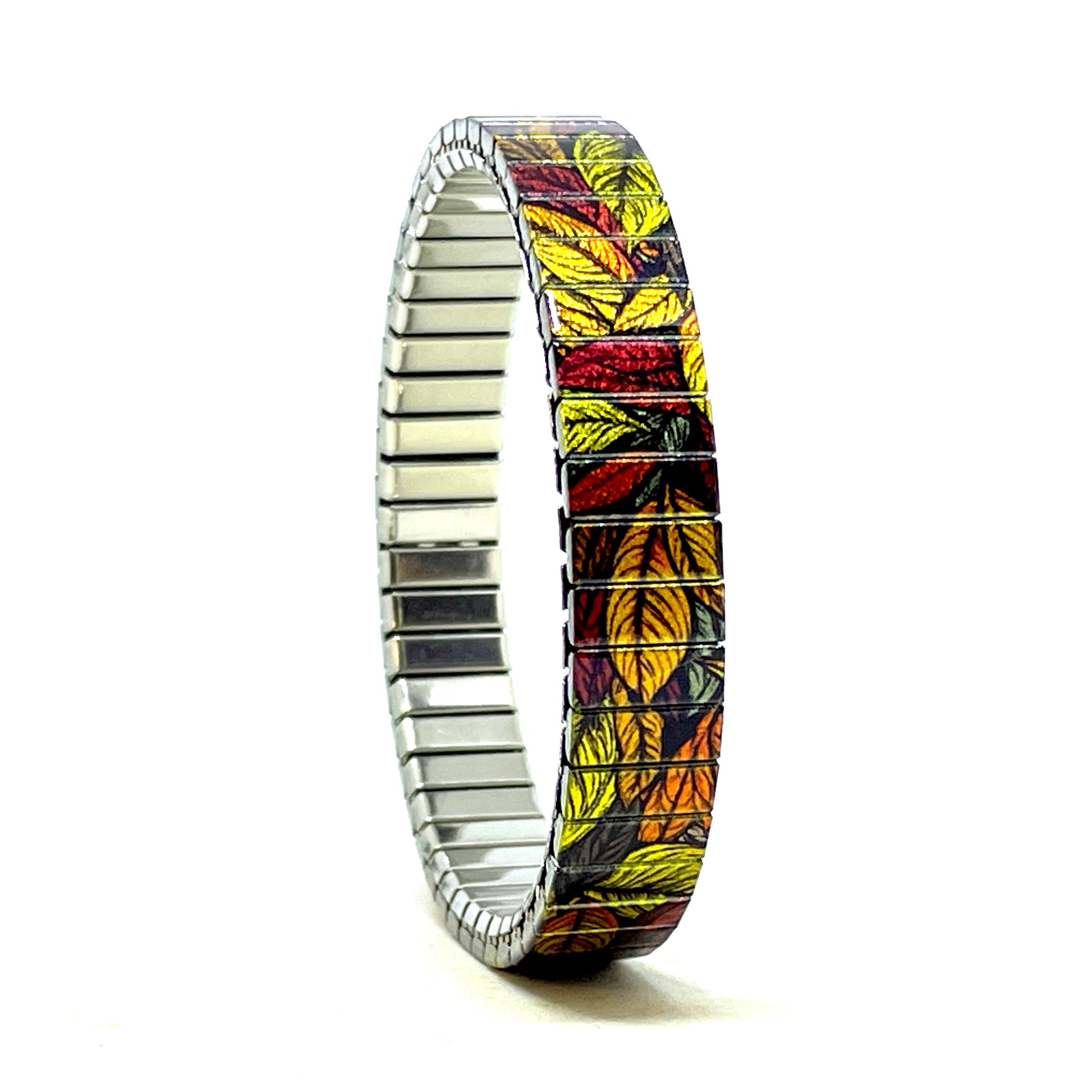 Stainlesssteel rekbare bracelet van 10 mm met zwarte ondergrond. Prachtige bloementuin met diverse herfstkleuren bladeren en bloemen. De afwerking is metallic.