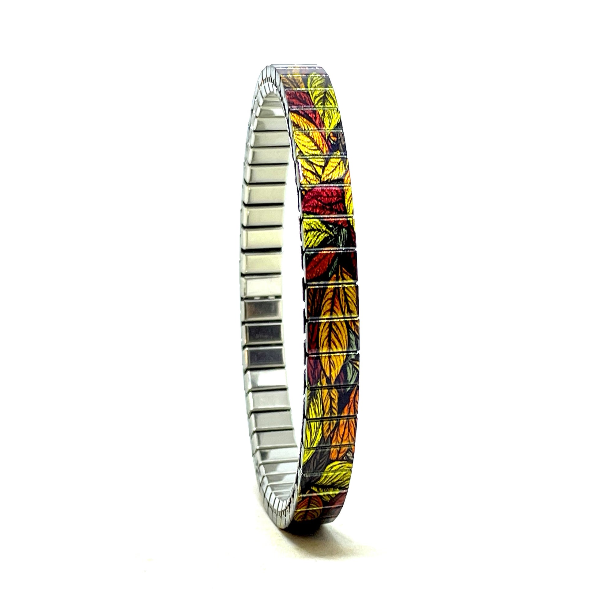 Rekbare armband van 6 mm stainlesssteel. Flowers Garden design met herstbloemen in diverse goud en zilvertinten. De afwerking is metallic.