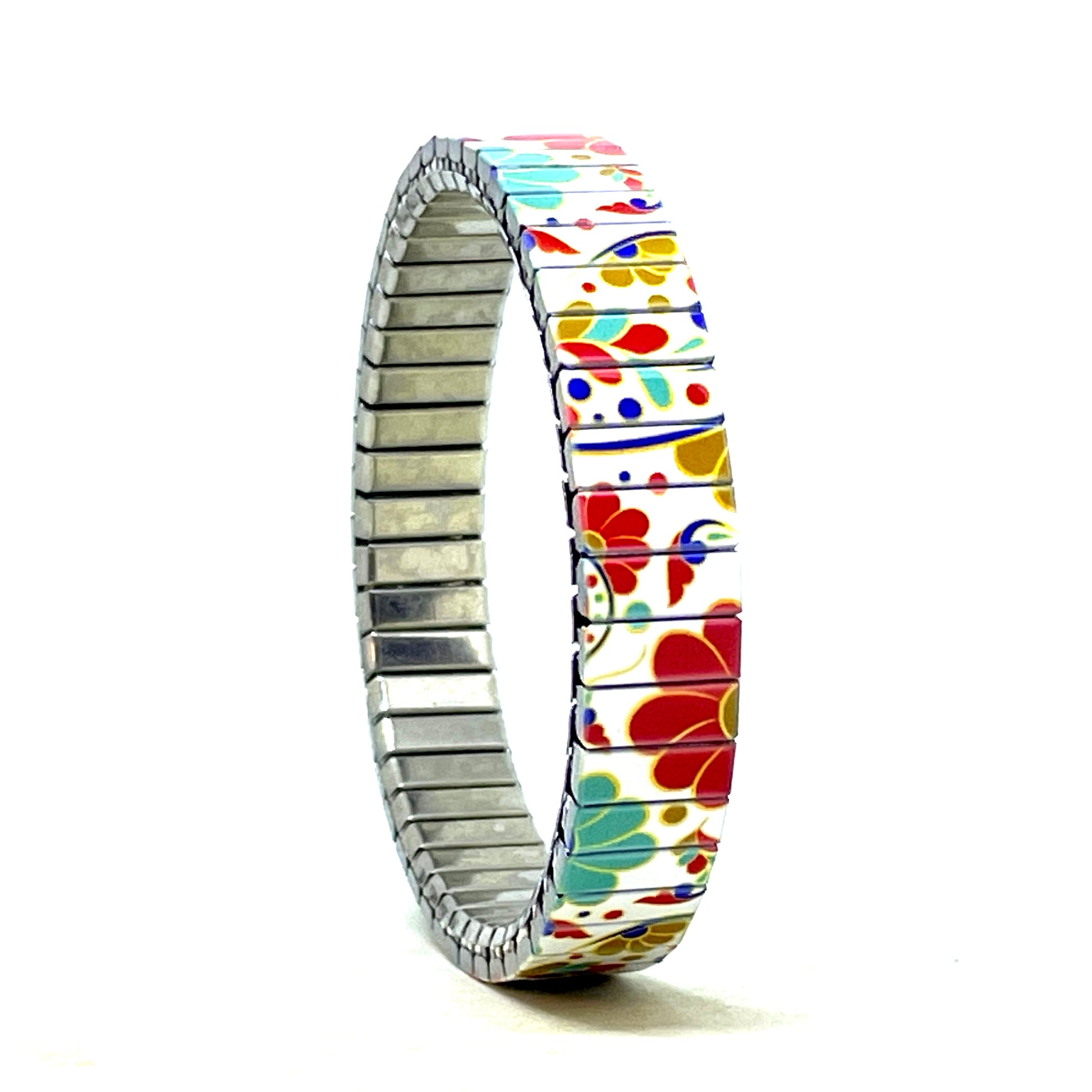 Rekbare armband 10 mm van stainlesssteel. Art design met een witte ondergrond en rood en turquoise bloemen details. De afwerking is polished.