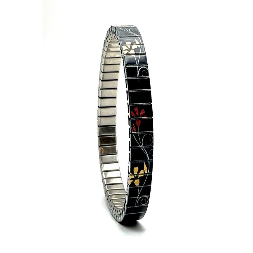 Rekbare armband van 6 mm stainlesssteel. Deze solo band is zwart met een lichte krans van gouden en wijnrode bloempjes. Stijlvol en neutraal.