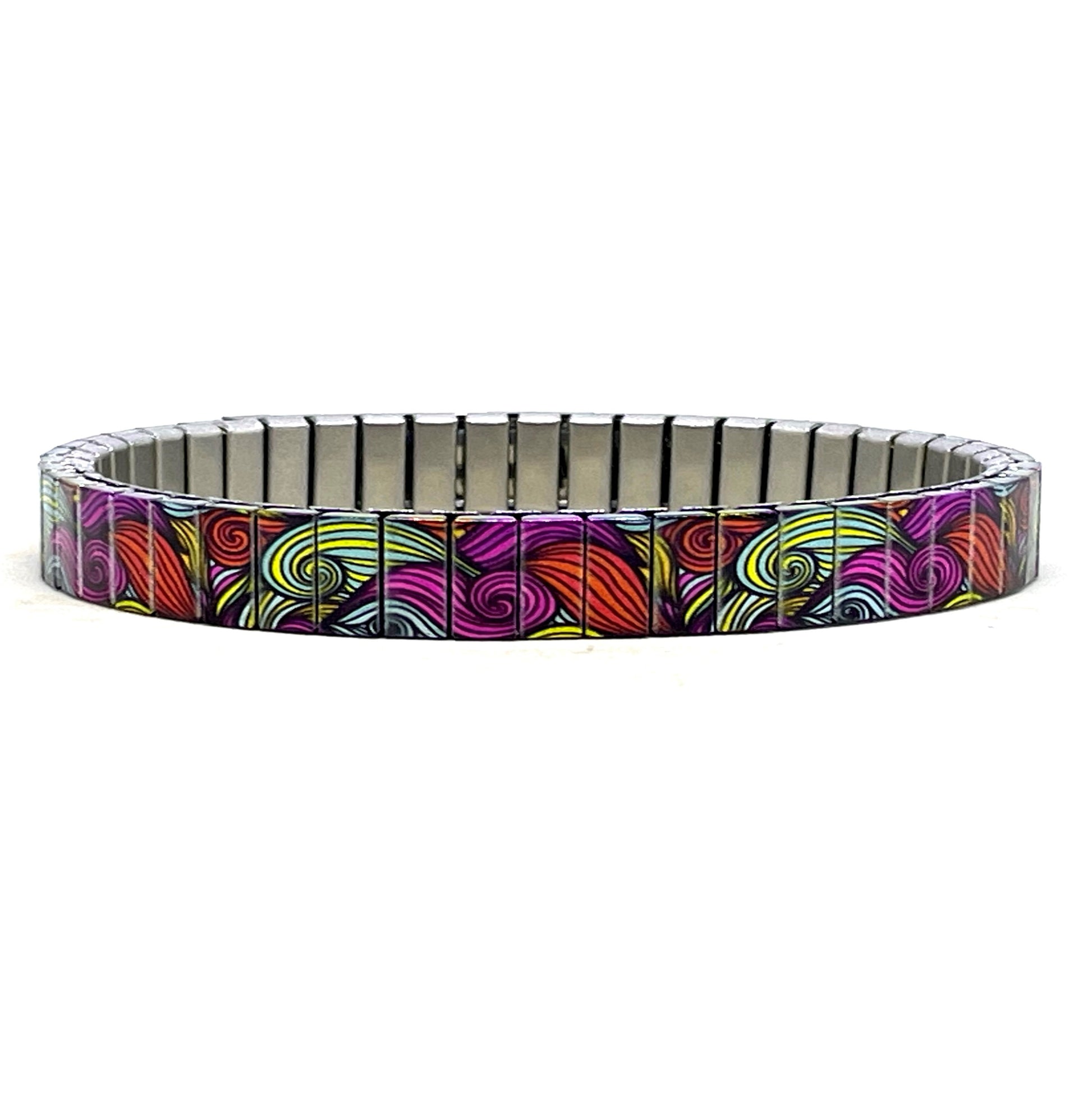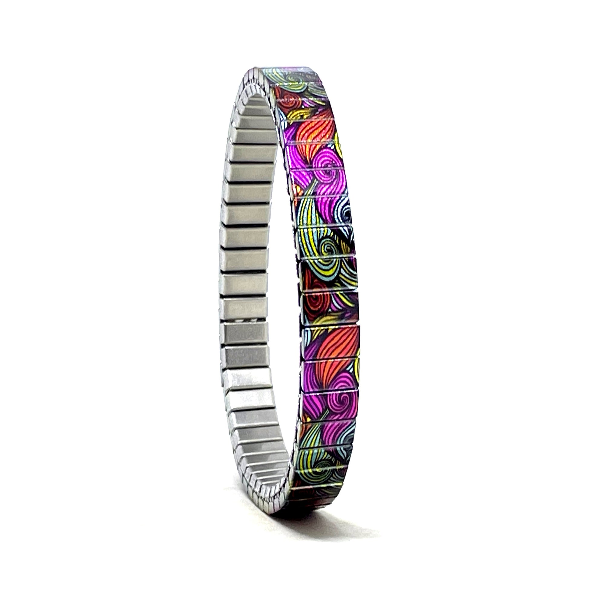 Rekbare armband van 6 mm stainlesssteel. Deze mooie waves lines laat een golvenzee zien van staalkleurige, zwarte en fuchsia kleuren. De metallic afwerking geeft de band extra glans.