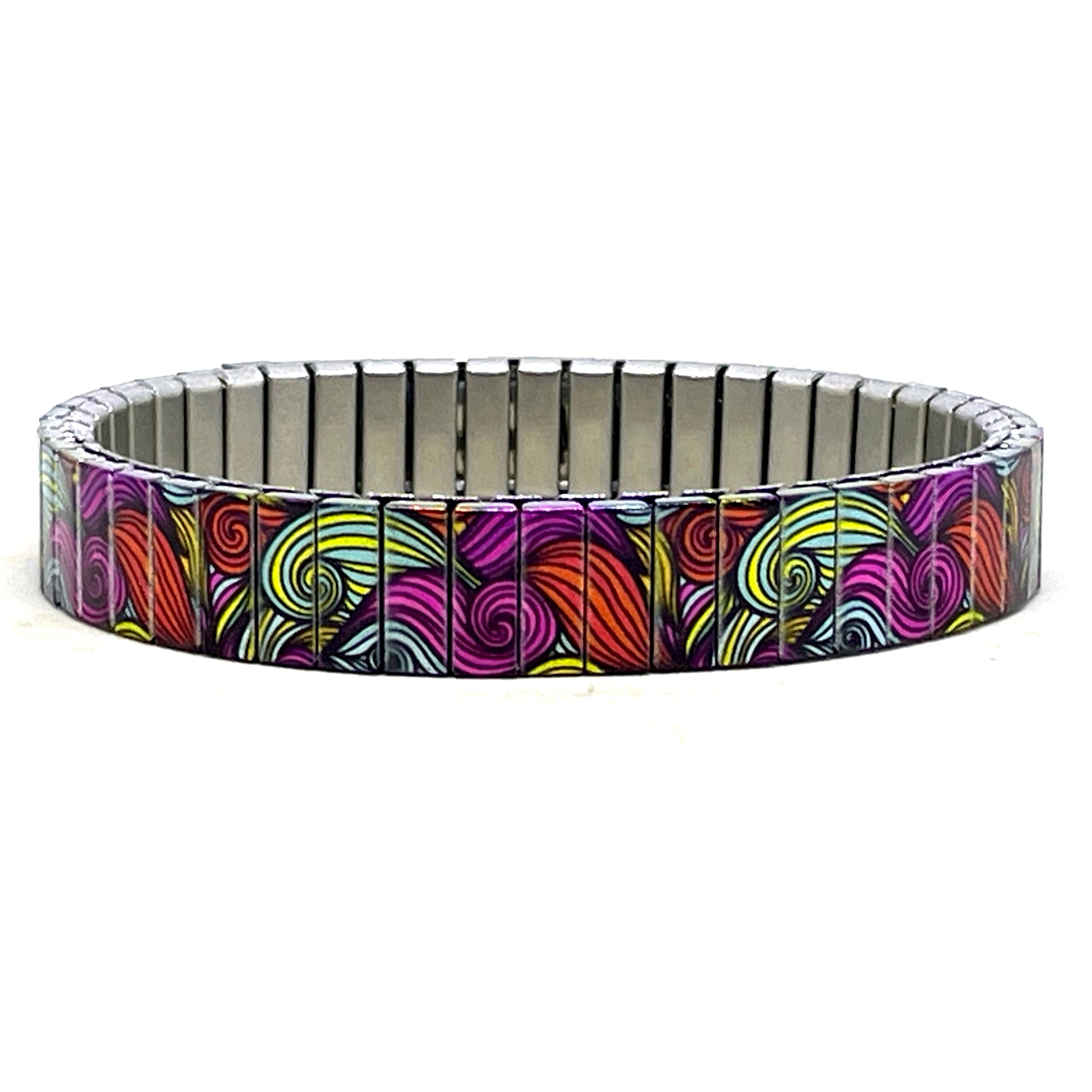 Rekbare armband 10 mm van stainlesssteel. Deze mooie waves lines laat een golvenzee zien van staalkleurige, zwarte en fuchsia kleuren. De metallic afwerking geeft de band extra glans.