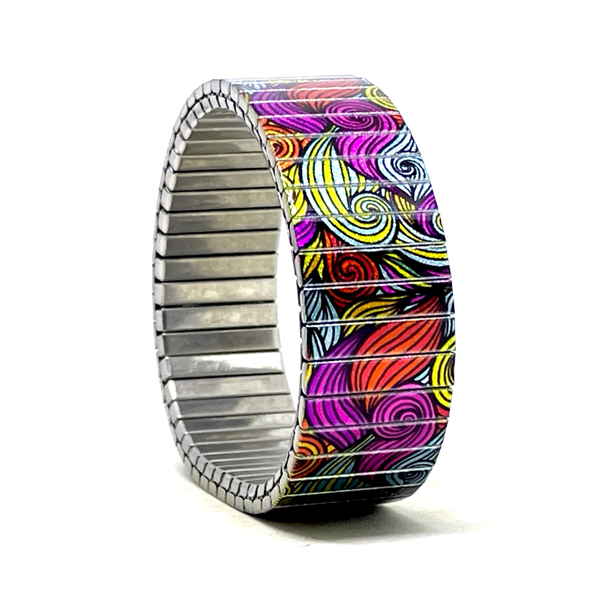 Rekbare armband van stainlesssteel. Deze mooie waves lines laat een golvenzee zien van staalkleurige, zwarte en fuchsia kleuren. De metallic afwerking geeft de band extra glans.