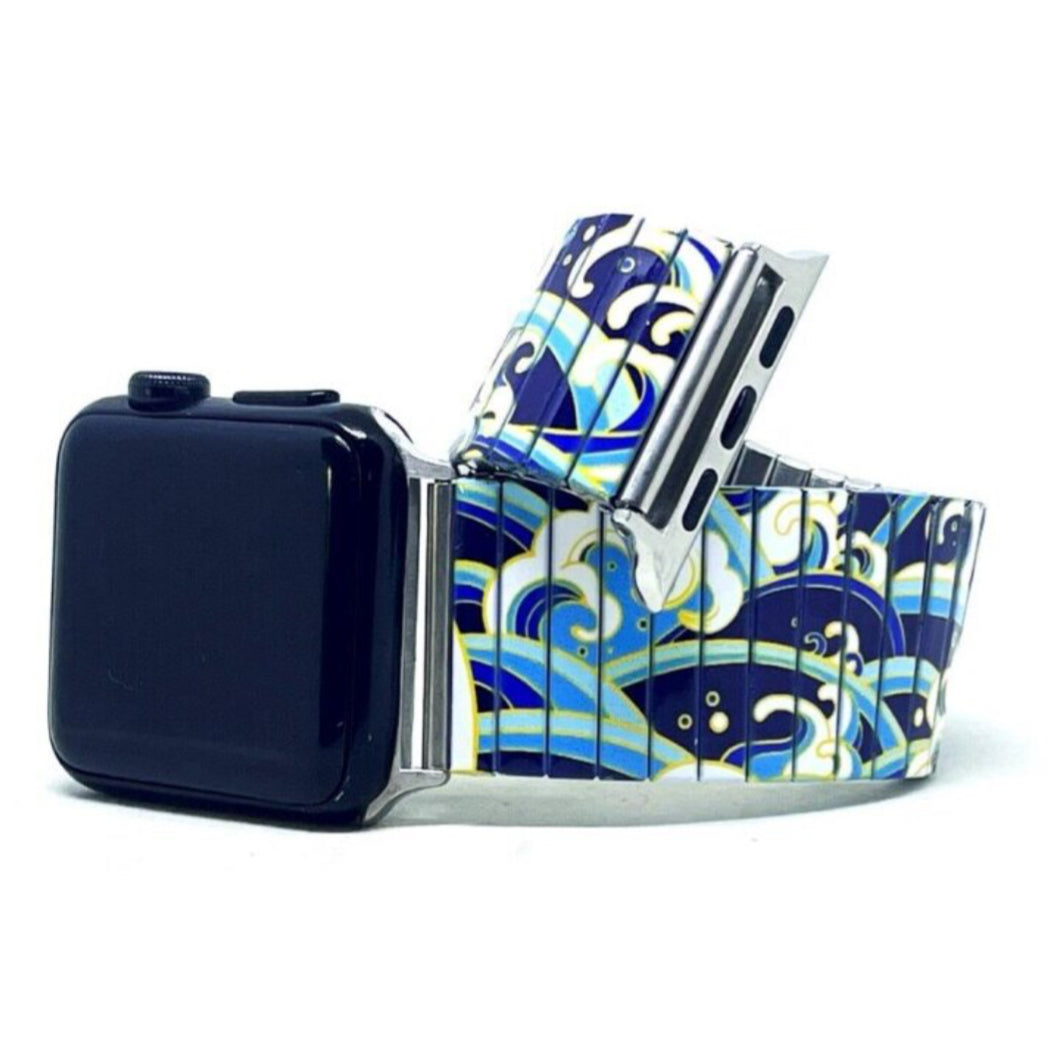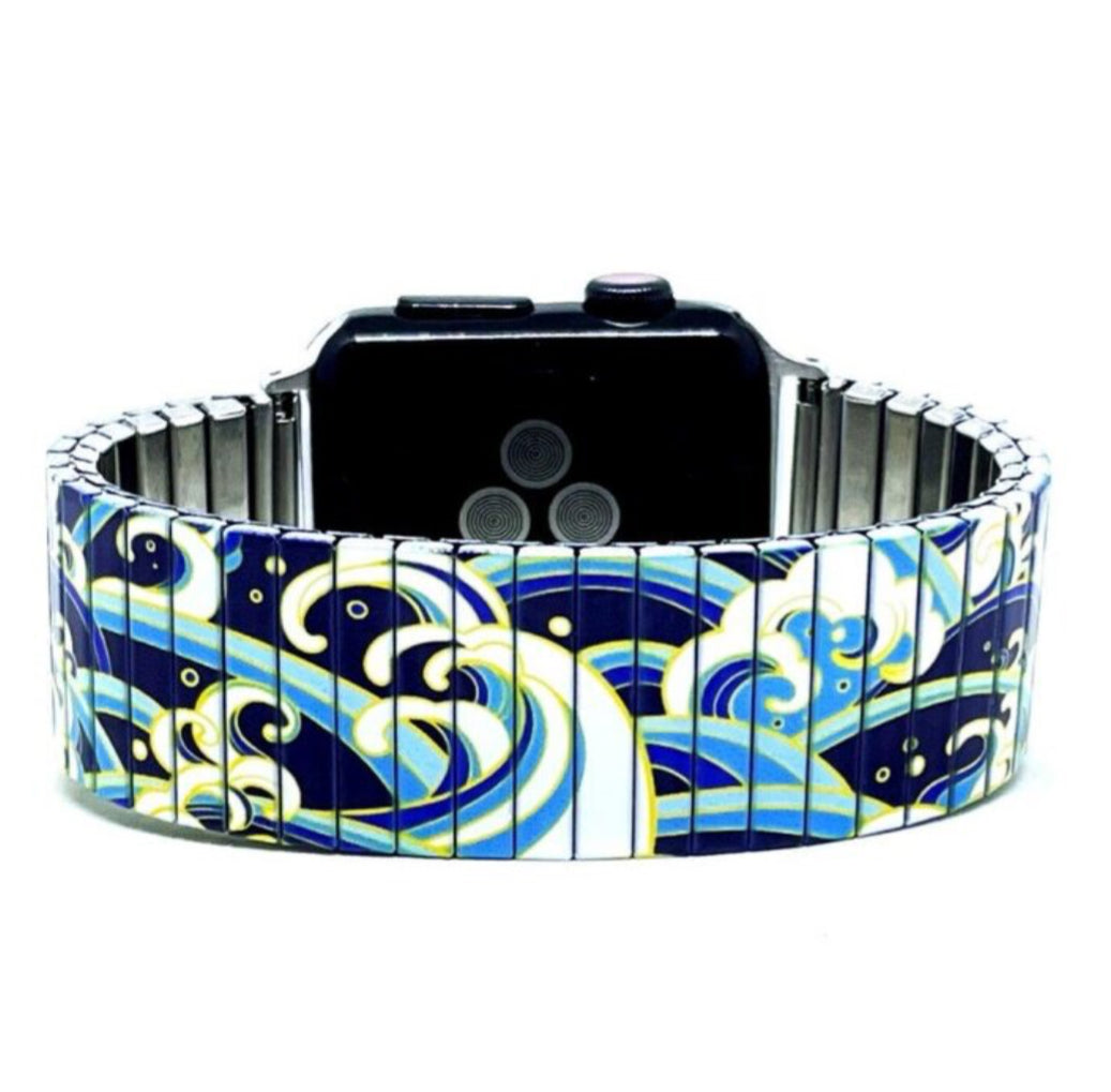 Rekbare Applewatch bracelet 18 mm breed, van stainlesssteel met een prachtig golven design. De polished afwerking geeft de band extra allure. Met deze Band om je pols maak je indruk op ieder terras deze zomer.