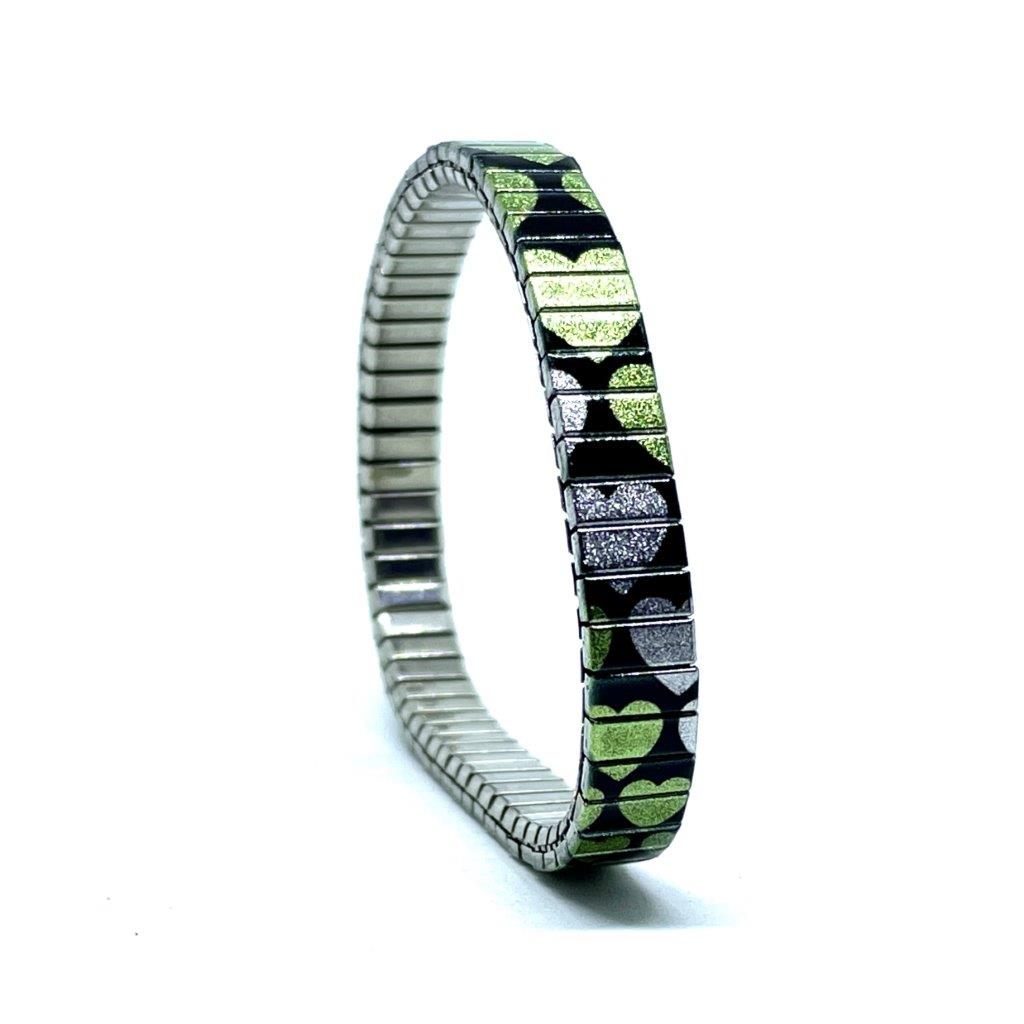 Rekbare armband van 6 mm stainlesssteel. With Love design groen met zilver en zwart. Afwerking is metallic.